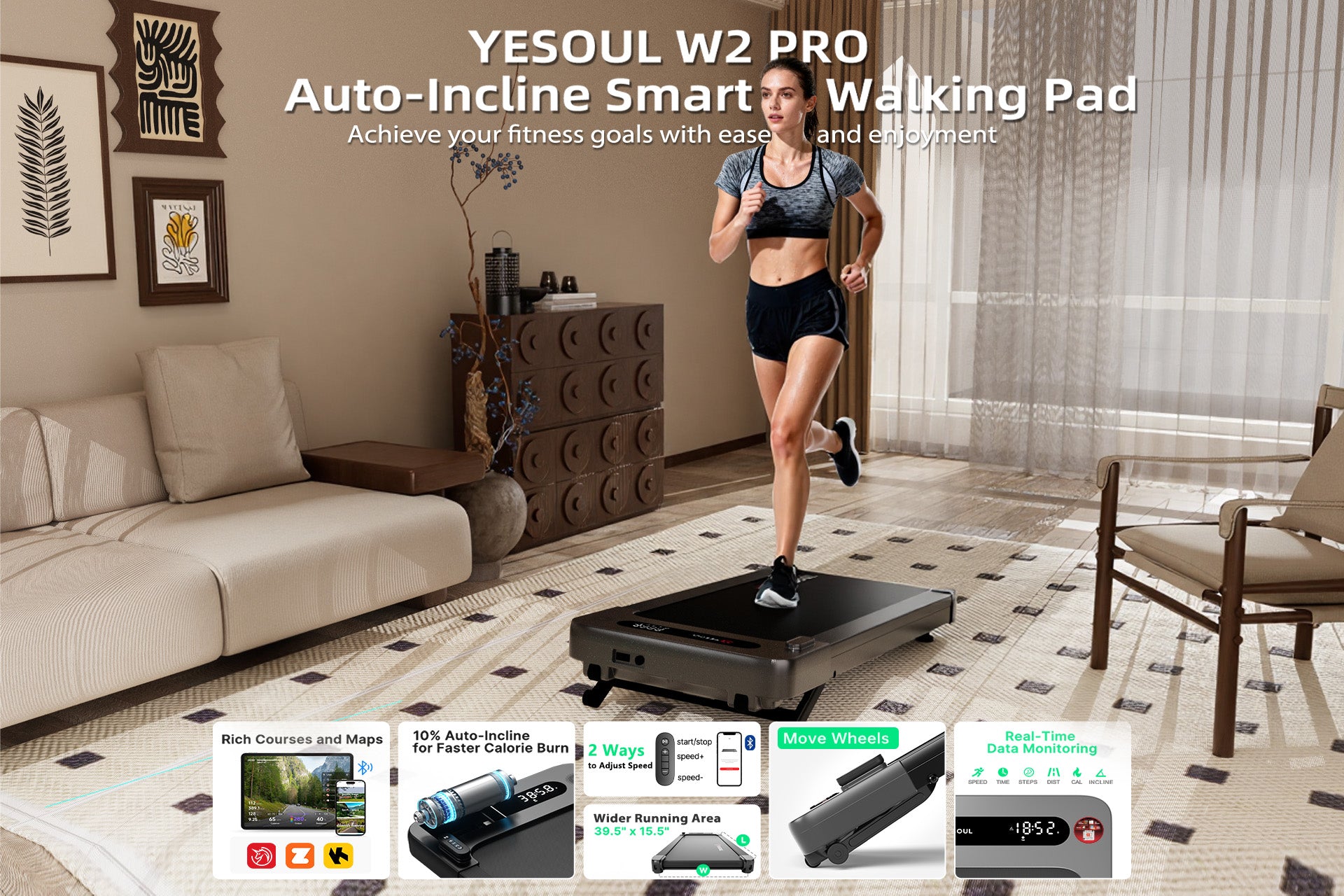 The Yesoul W2 Pro Walking Pad is designed for both home and office. Walk freely in your living room for daily exercise, or slide it under your desk to stay active while you work. Switch effortlessly between different modes to fit your lifestyle.